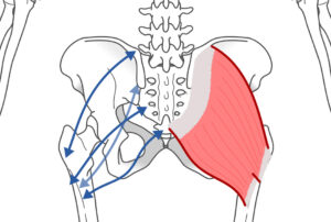 お尻の筋肉、大臀筋は仙骨と腸骨についているので、この結果、大臀筋は伸ばされて広がっていきます。