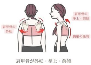 上述した通り、仙腸関節の緩みがあると仙骨後傾位、寛骨前傾外転位となり、背骨も丸まっていきますが、こうなると、骨連鎖によって肩甲骨も前傾外転位となります。