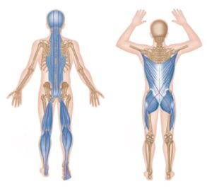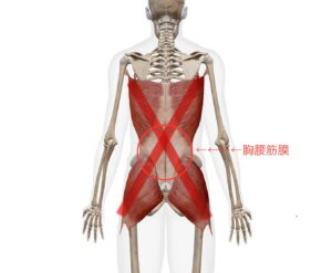 これは胸腰筋膜という広背筋と大臀筋をXにつなぐ筋膜連鎖や、ポステリアチェーンという広背筋、脊柱起立筋群、僧帽筋、大臀筋、ハムストリングなどの身体背面全体の筋膜連鎖が深く関わっています。
